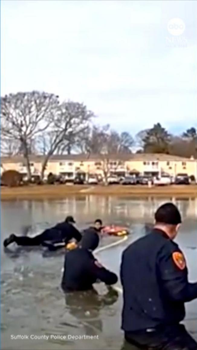 Vào đúng ngày Giáng Sinh, các nhân viên cảnh sát đã anh dũng giải cứu một cậu bé 8 tuổi sau khi em này bị rơi xuống ao băng ở Long Island, New York. Vụ việc xảy ra khi cậu bé đang vui chơi gần một cái ao thì không may bị ngã xuống. Lực lượng cảnh sát đã nhanh chóng có mặt tại hiện trường và giải cứu thành công cậu bé.